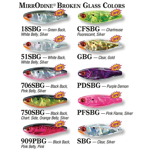 The ever popular MirrOdine ® 17MR has 10 NEW colors to compliment’s wide-body profile and realistic baitfish pattern. The NEW MirrOdine ® Broken Glass Series feature bright, reflective, broken glass foil inserts, “fish-calling” rattles and natural 3-D eyes to enhance their realism, plus extra-strong hooks. With a twitching retrieve, these baits dart from side-to-side, mimicking a wounded baitfish. Trout, Redfish, Snook, Striped Bass and Tarpon find the MirrOdines ® to be irresistible.