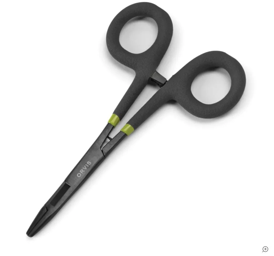 A strong pair of hemostatic forceps with built-in scissors for versatility, powered by Loon Outdoors. Matte black rust-resistant finish on surgical stainless steel. Double-dipped Comfy Grip handles offer a secure and comfortable grip even when wet. Locking handles with half smooth, half serrated jaw for positive grip. Hook-eye cleaner.