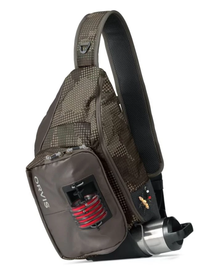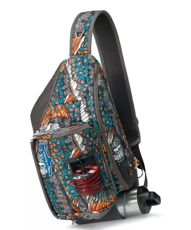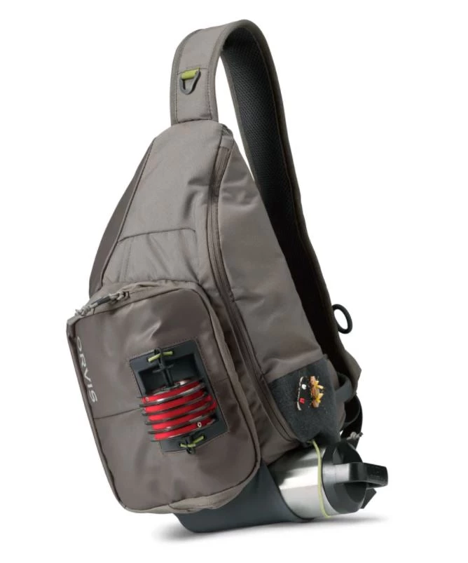 The best-selling Orvis fly-fishing Sling Pack has been updated and improved not only for durability, but with innovative new convenience features as well. The 100% recycled ECO CORDURA® platform is designed to store, organize, and offer easy, intuitive accessibility while staying completely out of your way when fishing. New features include the Tippet Whippet recessed docking station with tippet bar included for instant, fixed, and fumble-free access for up to six spools. Main compartment has zippered security pocket with key fob and stretch mesh pockets for small sort storage. Front drop-down has zippered pocket with elastic mesh slip pockets. Lo-pro zinger/nipper pass-through, easy swing handle, and water bottle holder with retainer. Front strap “dashboard” offers multiple docking stations for forceps and small tools as well as sliding adjustment for sternum strap. Left shoulder design frees up casting arm and shoulder. Weight: 500g/1.1 lbs.