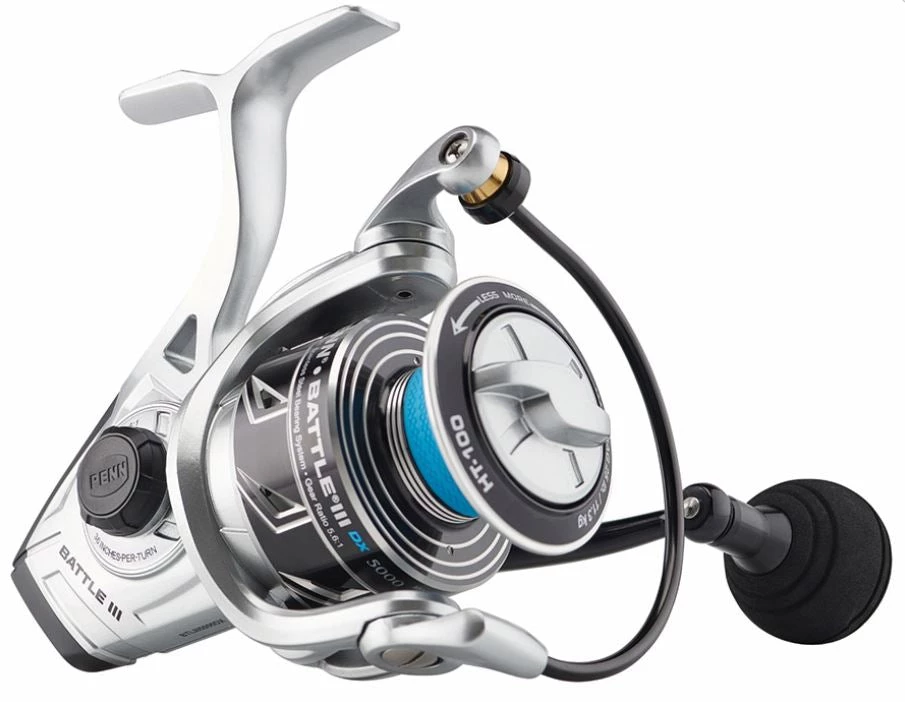 Penn Battle III DX Spinning Reels are built tough to withstand whatever the saltwater angler puts these reels through. The Battle III DX reels are more powerful than the previous Battle III spinning reels. Brass main gears are in every size along with an improved HT-100 drag system. Transfer more power through the gears to your big catch on the other end of the line with oversized EVA handle knobs.