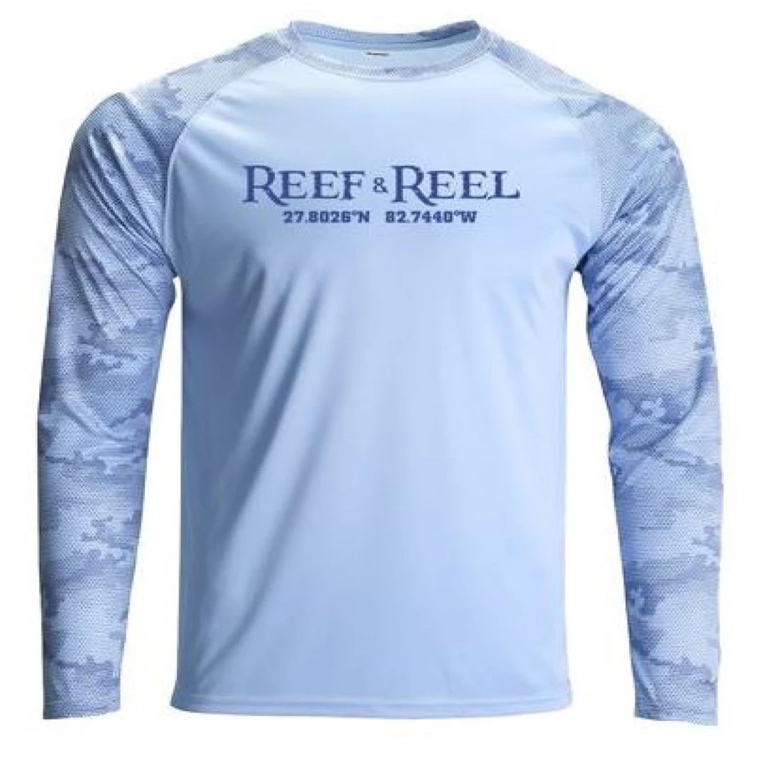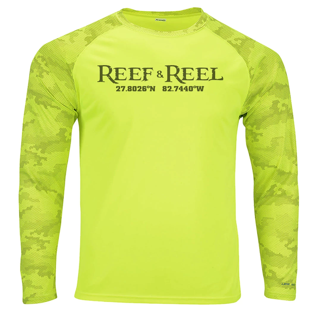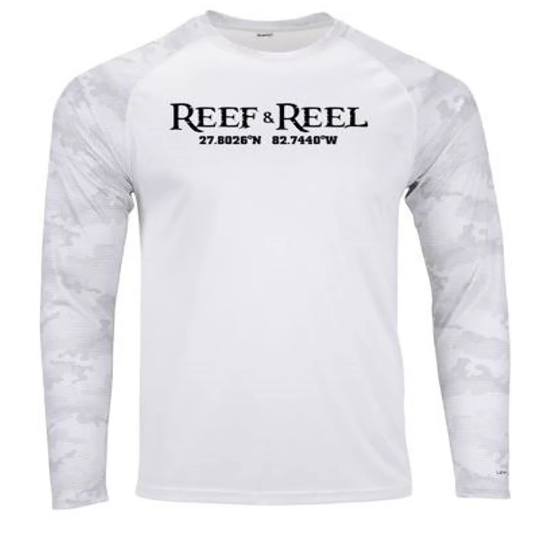 The Reef & Reel Coordinates Performance Shirt shows all anglers how to get back to your favorite supply store for whatever you may need. Just punch in the coordinates into your GPS and come on down! Reef & Reel is there for you while on the sand or the sea!