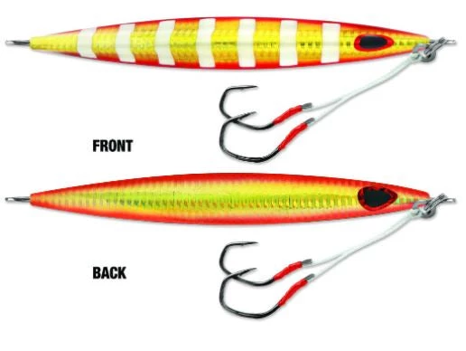 The asymmetrical Kensaki cuts water fast with its knife-tip design, allowing it to get deep. The “in line“ eyelets stabilize the jig during descent and enhance the fluttering action under slack line. Use a ‘lift & fall’ slow-pitch technique to get the Kensaki darting aggressively upwards during the lift, followed by a very tight horizontal flutter on the fall.